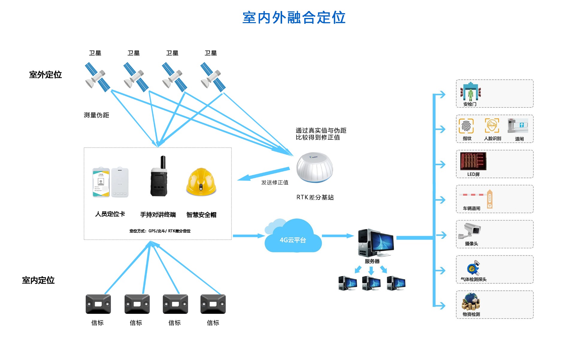 新銳科創(chuàng)基于多模式融合定位技術(shù),將4G/5G、低功耗藍(lán)牙(BLE)、北斗衛(wèi)星定位系統(tǒng)、載波相位實(shí)時(shí)差分(RTK)等技術(shù)有機(jī)融合,打造4G/5G+藍(lán)牙+北斗RTK人員定位系統(tǒng)。