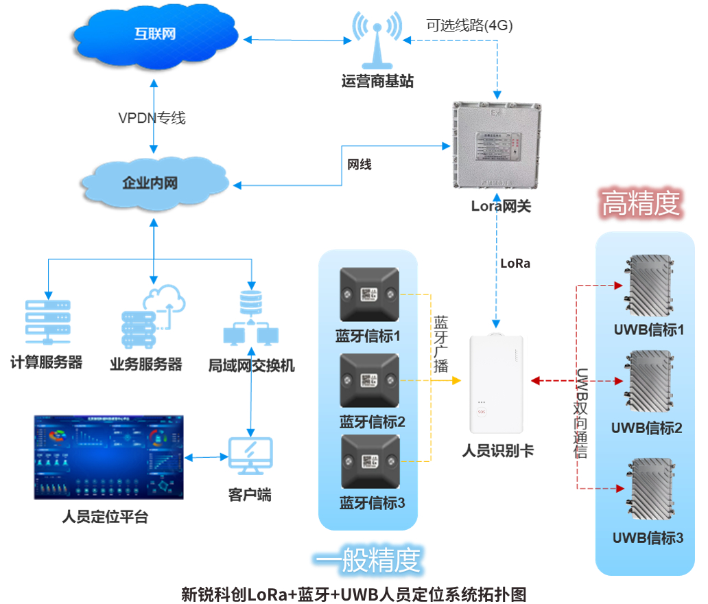 新銳科創基于融合定位技術將藍牙和UWB技術結合起來,利用LoRa進行數據傳輸,打造LoRa+藍牙+UWB人員定位系統。該系統充分考慮到企業的定位需求,既能滿足室內外高精度定位,又能合理控制預算,是一個極具性價比的室內外融合定位方案。
