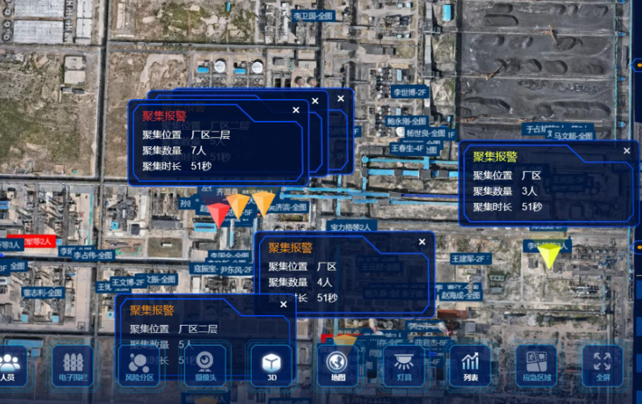 實時監(jiān)測任意位置的聚集風險,展示人員聚集數(shù)量及人員信息清單,可根據(jù)人員聚集程度,進行不同等級預警。