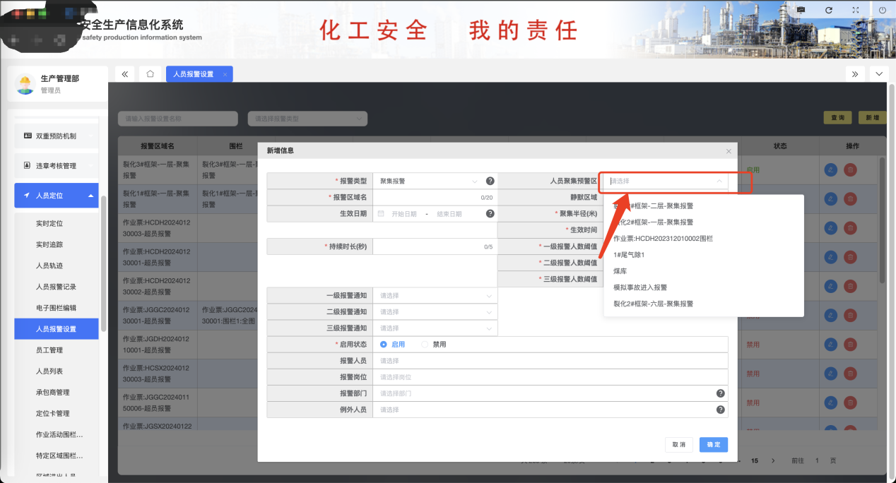 系統(tǒng)支持在電子地圖上自定義設(shè)置電子圍欄,可設(shè)置電子圍欄范圍,圍欄生效時(shí)間、限定人數(shù),并且可以根據(jù)內(nèi)部企業(yè)情況自由設(shè)置報(bào)警類型,例如滯留、闖入、越界、靜置、超時(shí)等報(bào)警類型。